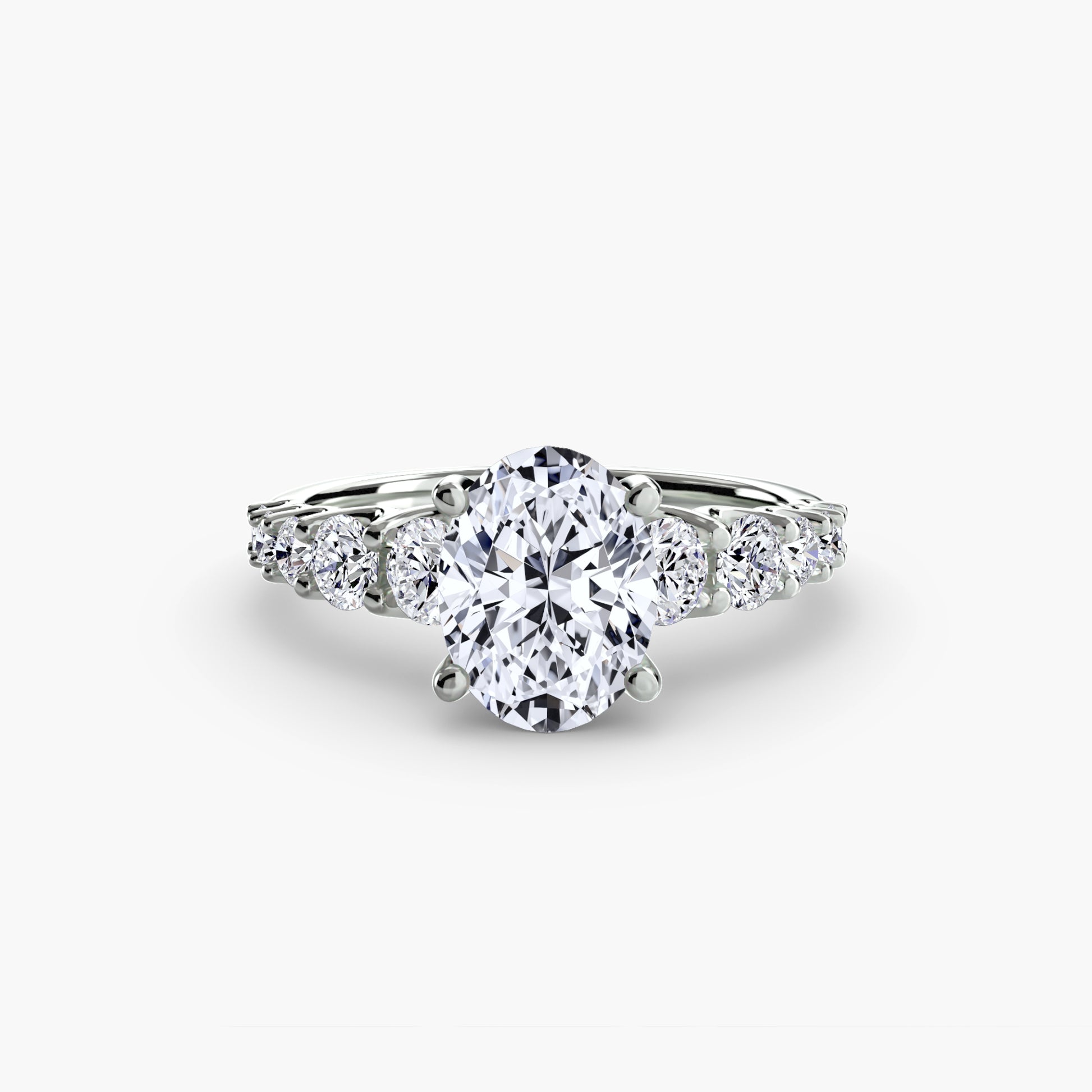 La Montura con Acentos Graduados combina la elegancia atemporal del solitario con una secuencia de diamantes laterales de tamaños progresivos, que fluyen de manera natural hacia el diamante central.