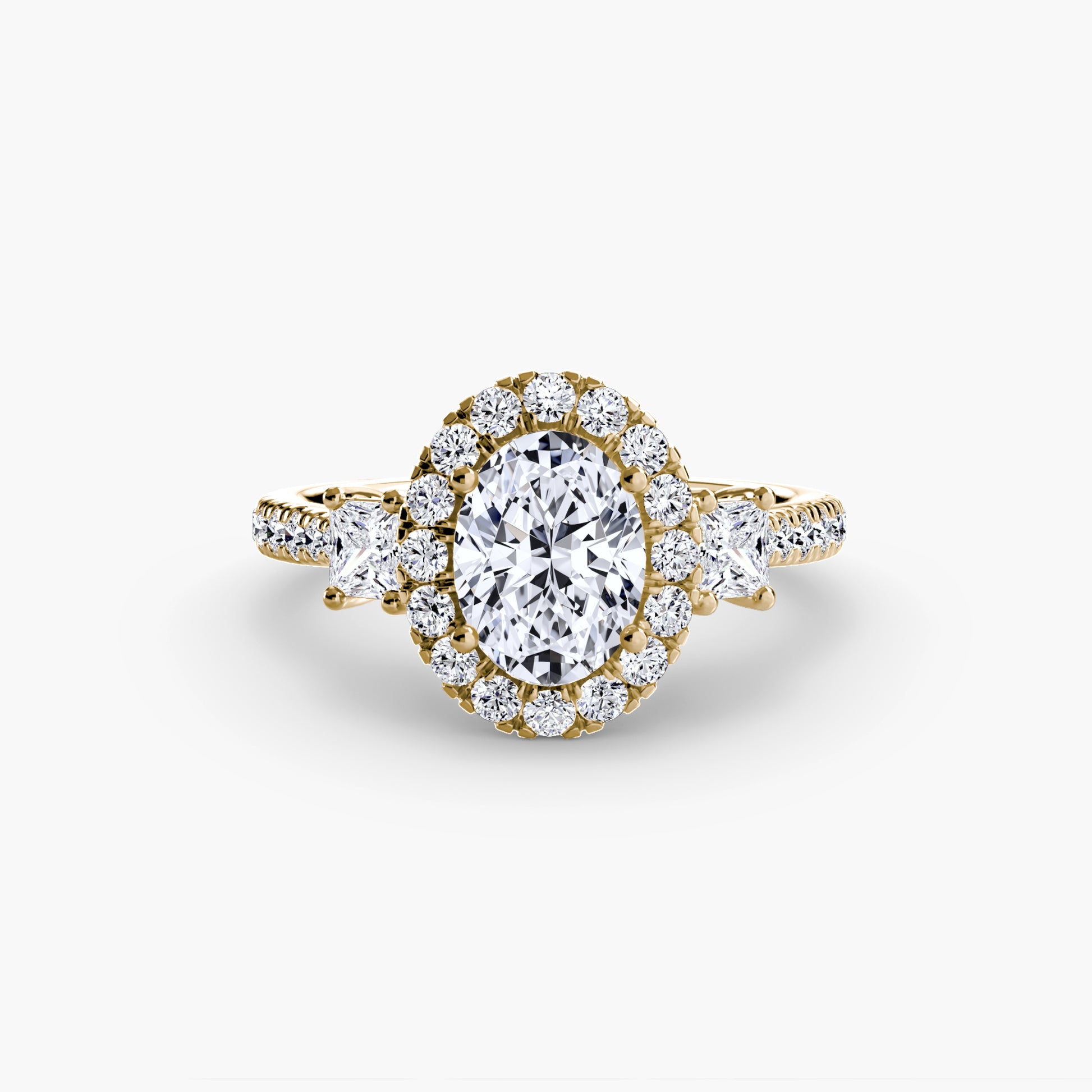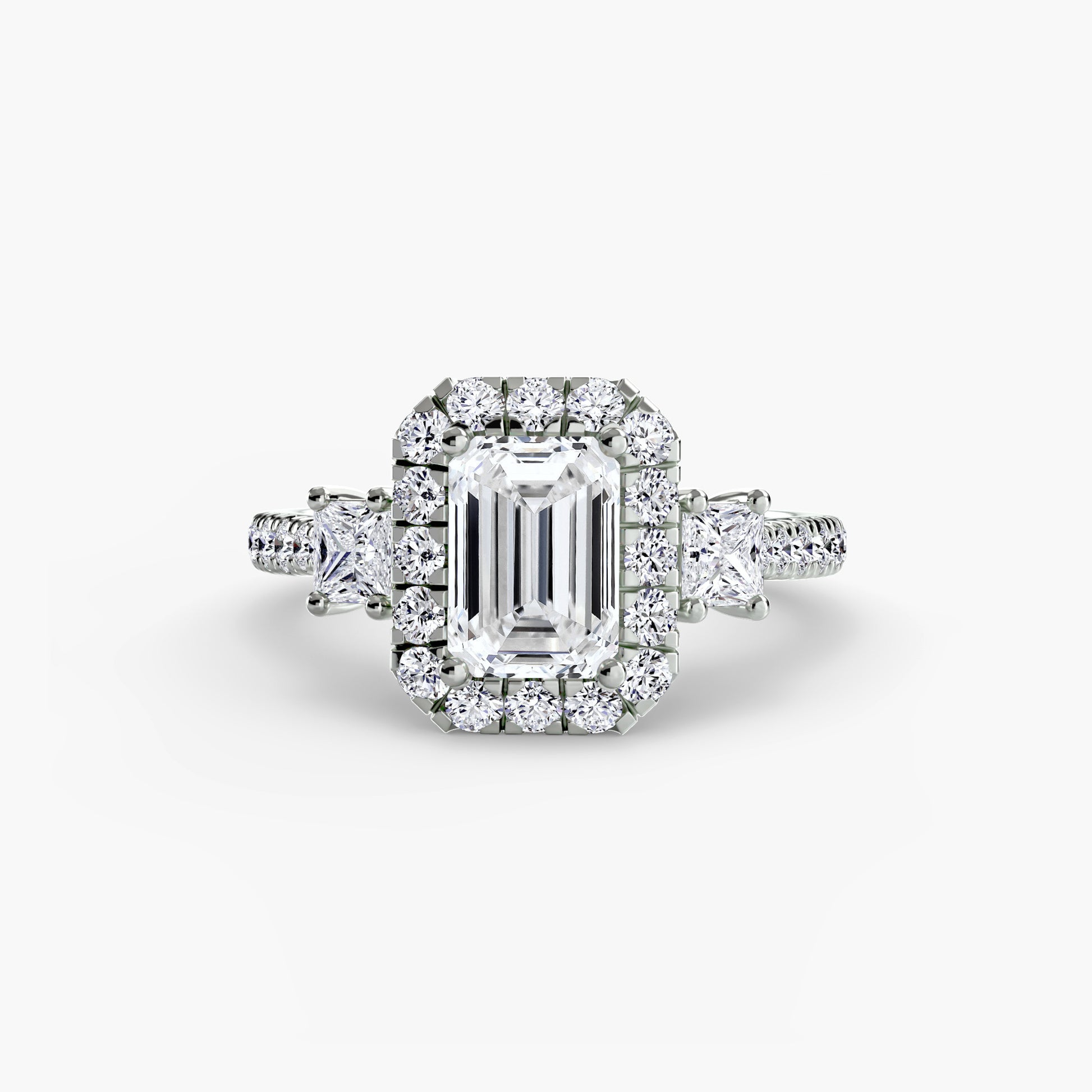 Montura Trilogía Halo Radiante – Anillo de tres diamantes con halo y destellos laterales